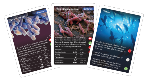 Shuffle the MicrobeCards and deal them into piles so that all players have an equal pile. Each player holds their cards in their hand so that you can see all your cards without others seeing them. The youngest player starts. He/she places one, two or three cards belonging to the same domain (bacteria, archaea or eukaryotes). After this, the game goes clockwise. The next player can either throw the same number of cards within the selected category or pass. The round is won by the person who passes last. However, a player can also choose to lay down one virus card that acts as a joker and clears the table. With this, the player immediately gets played in the next round.