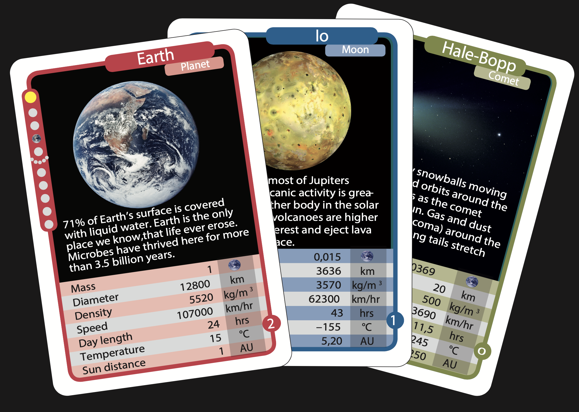 • The comets (Halley’s comet, Hale Bopp, Tempel 1, and Shoemaker Levy 9) are wild cards and can replace any other card.